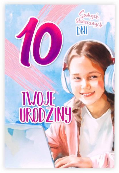 Nowoczesna i pełna pozytywnej energii kartka od producenta Kartki z Kotkiem, stworzona specjalnie z myślą o dziewczynkach obchodzących swoje 10 urodziny. Na okładce uśmiechnięta dziewczynka w słuchawkach oraz duża, błyszcząca cyfra 10, a w tle pastelowe, różowo-niebieskie barwy – idealne połączenie dla młodej miłośniczki muzyki i kolorowych emocji!