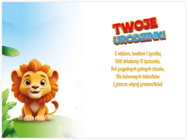 Cechy produktu: ✔ Format: B6 – praktyczny rozmiar, idealny do prezentu. ✔ Zdobienia: złocenia i tłoczenia – efekt trójwymiarowy i połysk. ✔ Motyw: sympatyczny lew wśród zieleni – idealny dla najmłodszych. ✔ Wnętrze: barwne, z rymowanymi życzeniami pełnymi radości. ✔ W zestawie: dopasowana kolorystycznie koperta.