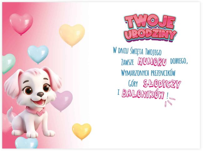 Cechy produktu: ✔ Format: B6 – praktyczny rozmiar, idealny do prezentu. ✔ Zdobienia: złocenia i tłoczenia – efekt trójwymiarowy i subtelny połysk. ✔ Motyw: uroczy piesek na różowym tle – idealny dla dziewczynek. ✔ Wnętrze: kolorowe, z gotowymi rymowanymi życzeniami. ✔ W zestawie: dopasowana kolorystycznie koperta.