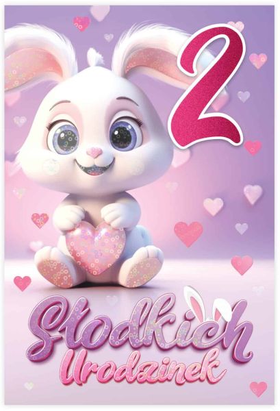 Urocza kartka urodzinowa z białym króliczkiem trzymającym serduszko to idealny wybór na drugie urodziny dla dziewczynki! Delikatna, pastelowa kolorystyka i połyskująca cyfra „2” nadają kartce wyjątkowego, cukierkowego uroku. Wykonana z najwyższej jakości papieru i ozdobiona błyszczącą folią metaliczną, zachwyca każdym detalem i wspaniale sprawdza się jako dodatek do prezentu.