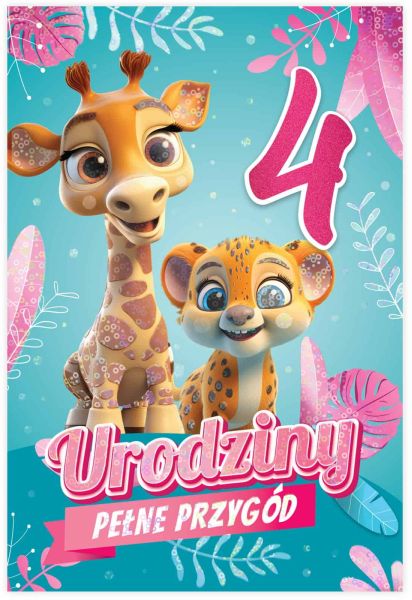 Kolorowa kartka urodzinowa z sympatyczną żyrafką i uroczym lampartem to doskonały wybór na czwarte urodziny dziecka! Pełna radości grafika, pastelowe kolory i błyszcząca cyfra „4” tworzą wyjątkowy, bajkowy klimat. Kartka została wykonana z wysokiej jakości papieru i ozdobiona metaliczną folią, dzięki czemu pięknie się mieni i prezentuje niezwykle efektownie – idealna dla małych miłośników zwierzątek i przygód.