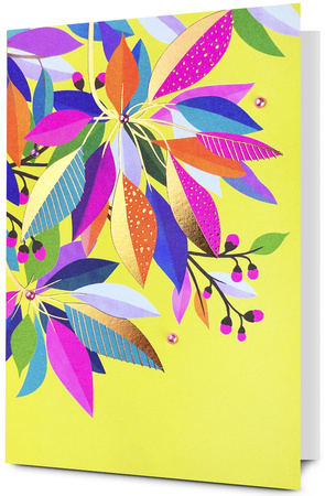 Kartka jest bogato i różnorodnie zdobiona (zależnie od wzoru: metaliczna folia, lakier perłowy, brokat, przyklejone elementy 3D - wypukłe wstawki papierowe, elementy biżuteryjne, tłoczenia). Kartka zawiera życzenia i kolorowy środek. W zestawie znajduje się koperta, kolorystycznie uzupełniająca się z kartką.