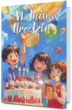 Kartka jest zdobiona opalizującą folią holograficzną, zawiera życzenia oraz kolorowy środek. W zestawie znajduje się koperta, kolorystycznie uzupełniająca się z kartką. Format złożonej kartki: B6