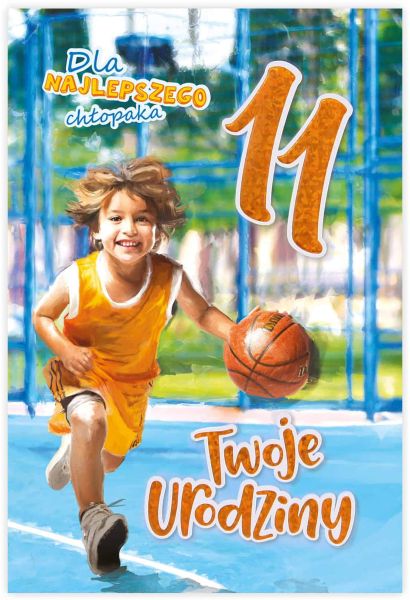 Cechy produktu: ✔ Efektowna, t³oczona cyfra „11” na froncie. ✔ Uszlachetnienia: z³ocenie i t³oczenie nadaj± kartce elegancji. ✔ Sportowa grafika – ch³opiec z pi³k± do koszykówki, ¿ywe kolory, du¿o dynamiki. ✔ Wnêtrze z gotowymi ¿yczeniami i barwnym ¶rodkiem. ✔ Koperta dobrana kolorystycznie. ✔ Format B6 – 13x19cm. ✔ Grupa cenowa: A.