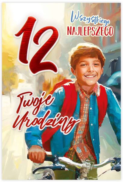 Idealna kartka na 12. urodziny ch³opca, który lubi ruch, wolno¶æ i dobre przygody. Du¿a, t³oczona cyfra „12” w mocnym czerwonym kolorze nadaje kartce wyrazisto¶ci, a ilustracja u¶miechniêtego ch³opca jad±cego na rowerze wprowadza lekki, miejski klimat. W ¶rodku znajduj± siê kolorowe ¿yczenia, a zestaw uzupe³nia dopasowana koperta – gotowa do sprzeda¿y w ka¿dym sklepie papierniczym czy prezentowym.