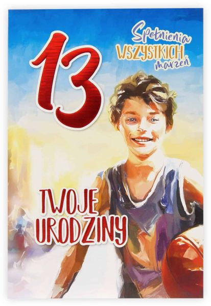 Cechy produktu: ✔ Efektowna, t³oczona cyfra „13”. ✔ Uszlachetnienia: z³ocenie oraz t³oczenie podkre¶laj±ce detale. ✔ Ch³opiêcy motyw koszykarski – dynamiczny, nowoczesny styl. ✔ Kolorowe ¿yczenia w ¶rodku. ✔ Koperta dopasowana do wzoru. ✔ Format B6 – 13x19cm.