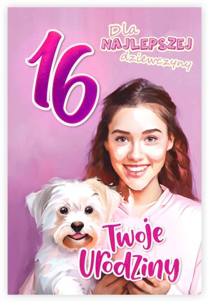 Idealna na 16. urodziny dla dziewczyny, która kocha zwierzêta i delikatne, pastelowe motywy. Du¿a, t³oczona cyfra „16” w intensywnym fioletowym odcieniu piêknie wyró¿nia siê na ró¿owym tle. Ilustracja u¶miechniêtej nastolatki trzymaj±cej uroczego pieska tworzy ciep³y, przyjazny klimat. W ¶rodku znajduj± siê kolorowe ¿yczenia, a ca³o¶æ uzupe³nia dopasowana koperta.