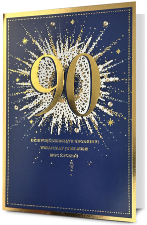 Kartka z okazji 90. urodzin to wyjątkowa propozycja dla uczczenia tego dostojnego jubileuszu. Złote zdobienia, ciemnogranatowe tło i rozbłyskujący motyw fajerwerków podkreślają wagę okazji, łącząc elegancję z podniosłą atmosferą. To idealny wybór na prezent dla babci, dziadka lub każdego bliskiego jubilata.