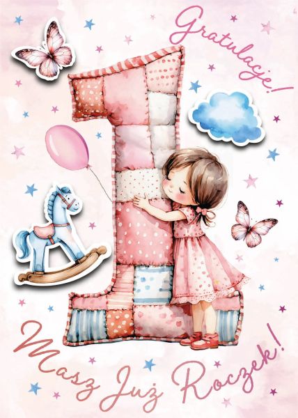 Ta urocza kartka urodzinowa to piękna i emocjonalna forma przekazania gratulacji z okazji pierwszych urodzin dziewczynki. Grafika przedstawia małą bohaterkę przytulającą dużą, miękką "1" wykonaną z kolorowych łatek – patchworkowy styl, który urzeka swoją ciepłą i przytulną estetyką. Całość uzupełniają pastelowe motywy: balonik, konik na biegunach, chmurki i motyle, tworząc niezwykle delikatną i dziewczęcą kompozycję.