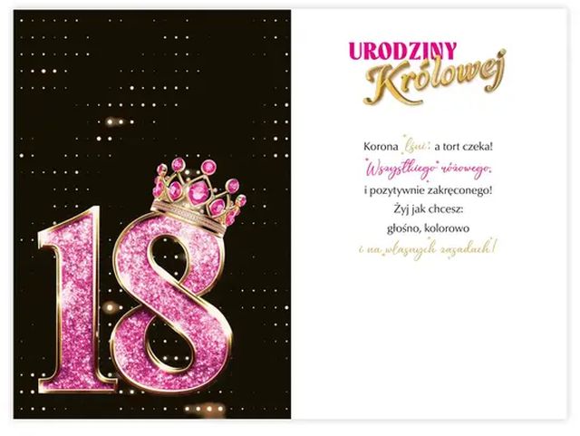 Idealna jako dodatek do prezentu – ta efektowna kartka premium wyróżni się na tle innych i sprawi, że solenizantka poczuje się naprawdę królewsko w dniu swoich osiemnastych urodzin.