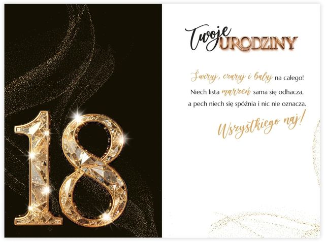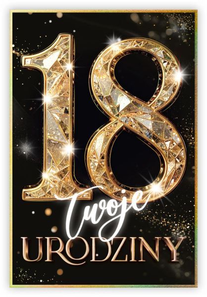 Karnet B6 „Twoje Urodziny” to luksusowa kartka premium z złotą cyfrą 18 o mozaikowym, kryształowym efekcie. Elegancka oprawa i intensywny połysk sprawiają, że kartka wyróżnia się na każdej ekspozycji urodzinowej.