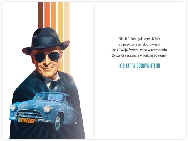 Karnet B6 w stylu retro z eleganckim mężczyzną i klasycznym autem. Idealna kartka urodzinowa dla prezesa, szefa lub lidera z klasą.