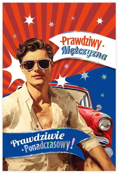 Karnet B6 z hasłem „Prawdziwy mężczyzna – ponadczasowy”, dynamiczna grafika retro i klasyczny samochód. Wyrazista kartka urodzinowa.