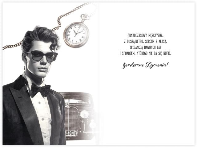 Stylowy karnet B6 z motywem zegarka kieszonkowego i klasycznego auta. Kartka urodzinowa retro z hasłem „Każdy rok dodaje charakteru