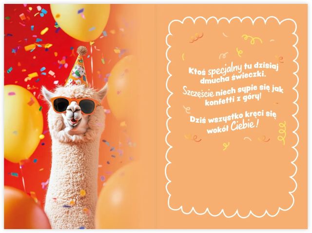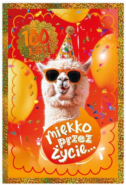 Kartka z lamą w okularach, balonami i konfetti oraz życzeniami „Sto lat!”. W środku zabawne życzenia dla dzieci i nastolatków.