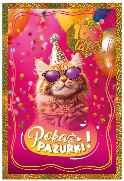 Kartka urodzinowa z kotem w okularach i czapeczce. Różowe tło, konfetti, błyszcząca ramka i życzenia „Sto lat!” na froncie.