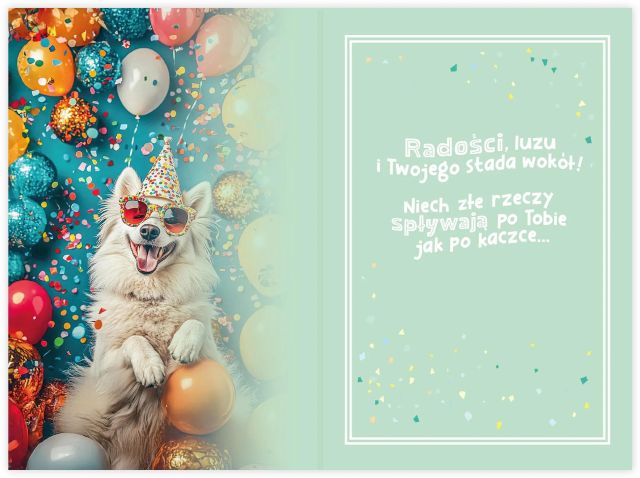 Karnet urodzinowy z uśmiechniętym pieskiem w okularach i czapeczce. Balony, konfetti, błyszcząca ramka i „Sto lat!” na froncie.