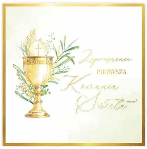 Zaproszenia na Komunię Świętą – Kielich Złoty i Zielone Gałązki 🌿✨