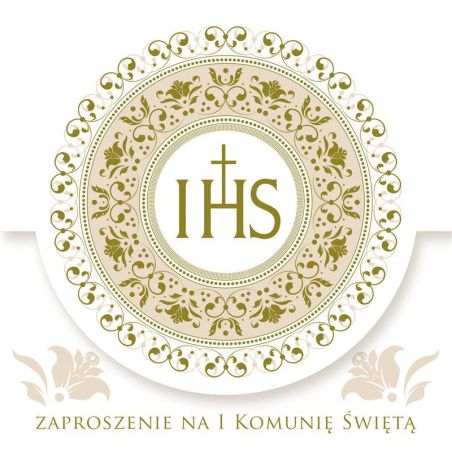 Bardzo eleganckie zaproszenie komunijne o klasycznym, reprezentacyjnym charakterze. Centralny motyw okrągłego medalionu z symbolem IHS i krzyżem, otoczony bogatym ornamentem roślinnym w odcieniach złota, przyciąga uwagę i podkreśla uroczysty wymiar Pierwszej Komunii Świętej. Kompozycja inspirowana tradycyjną sztuką sakralną sprawia, że zaproszenie idealnie wpisuje się w gust klientów szukających ponadczasowej elegancji. Wewnątrz znajduje się miejsce na potwierdzenie przybycia.
