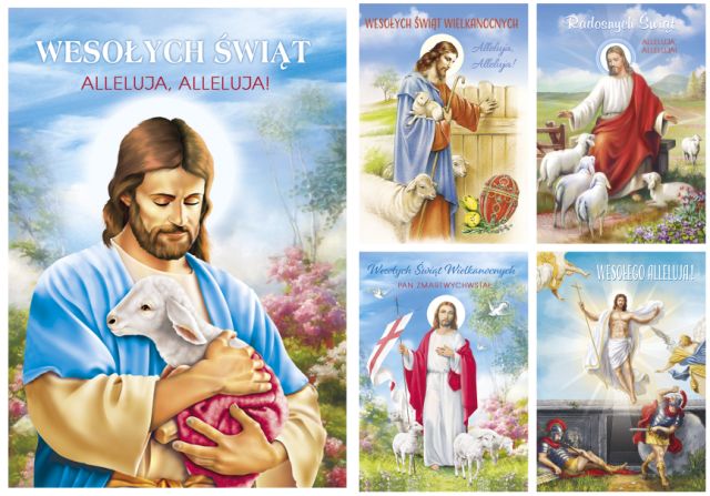 Klasyczna laurka wielkanocna B6B od POL-MAK, oparta wyłącznie na religijnej ikonografii: Chrystus Dobry Pasterz, Jezus z barankiem, Zmartwychwstanie, sceny biblijne silnie osadzone w tradycji kościelnej. To wzory kierowane do odbiorcy konserwatywnego, parafialnego, „do koperty od babci”, a nie pastelowego Instagrama. Format 117x167 mm to sprawdzony standard sprzedażowy, a dołączona koperta pozwala od razu wystawić produkt na haczyk lub półkę.