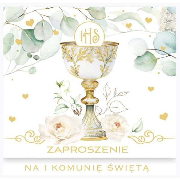 Eleganckie zaproszenie komunijne w formacie kwadratowym to klasyczny i ponadczasowy wybór na uroczystość Pierwszej Komunii Świętej. Delikatna grafika kielicha eucharystycznego, subtelne motywy roślinne oraz efektowne złocenie lub srebrzenie nadają całości wyjątkowo podniosły charakter. Zaproszenie posiada miejsce na potwierdzenie przybycia, co czyni je praktycznym rozwiązaniem dla organizatorów uroczystości. Idealne do sprzedaży w sklepach papierniczych i z asortymentem komunijnym.