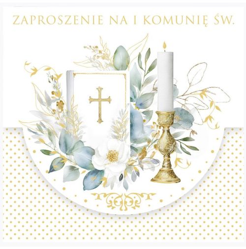 Cechy produktu: ✔ Format: 120x120 mm – elegancki, kwadratowy rozmiar. ✔ Motyw: I Komunia Święta – Biblia, krzyż, świeca i elementy florystyczne. ✔ Uszlachetnienie: złocenie lub srebrzenie – efekt dekoracyjny klasy premium. ✔ Styl: klasyczny, bogatszy, bardzo uroczysty. ✔ Wnętrze: miejsce na wypisanie danych oraz potwierdzenie przybycia. ✔ Komplet: zaproszenie + dopasowana kolorystycznie koperta. ✔ Pakowanie: zestaw 10szt. ✔ Producent: POL-MAK – wysoka jakość wykonania i estetyki.