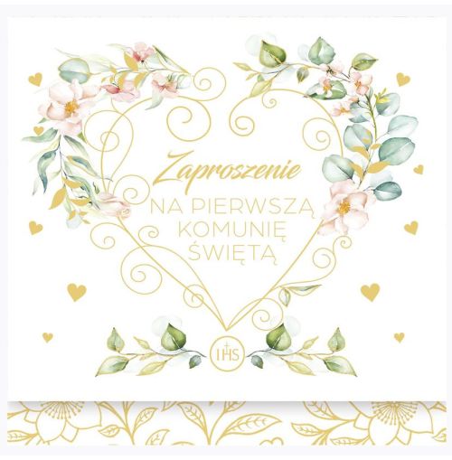 Wyjątkowo eleganckie zaproszenie komunijne w kwadratowym formacie, wyróżniające się romantycznym motywem serca utworzonego z delikatnych gałązek, kwiatów i subtelnych zdobień. Złote ornamenty, drobne serduszka oraz symbol IHS nadają całości uroczysty i ciepły charakter. Jasna, pastelowa kolorystyka sprawia, że zaproszenie prezentuje się lekko, a jednocześnie bardzo odświętnie. Zaproszenie posiada miejsce na potwierdzenie przybycia, co czyni je praktycznym wyborem przy organizacji uroczystości Pierwszej Komunii Świętej.