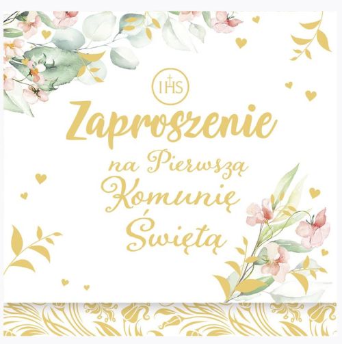 Eleganckie zaproszenie komunijne w kwadratowym formacie, z wyraźnym kaligraficznym napisem i delikatną kompozycją roślinną w pastelowych barwach. Złote akcenty, drobne serduszka oraz symbol IHS nadają całości odświętny, a jednocześnie lekki charakter. Harmonijna grafika sprawia, że wzór jest uniwersalny i bardzo czytelny, idealny na uroczystość Pierwszej Komunii Świętej. Zaproszenie zawiera miejsce na potwierdzenie przybycia, co zwiększa jego praktyczność.