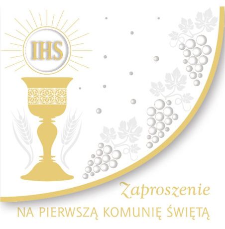 Eleganckie zaproszenie komunijne w kwadratowym formacie, z wyraźnym motywem kielicha eucharystycznego z symbolem IHS, promieniami światła oraz dekoracyjnymi winogronami. Subtelne złocone elementy i jasna, harmonijna kolorystyka nadają całości uroczysty, klasyczny charakter, idealny na Pierwszą Komunię Świętą. Przemyślana kompozycja łączy symbolikę sakramentu z estetyką premium. Zaproszenie zawiera miejsce na potwierdzenie przybycia, co ułatwia organizację uroczystości.