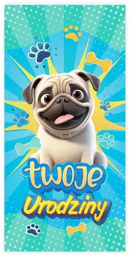 Karnet urodzinowy w formacie DL z motywem uroczego mopsa to radosna propozycja dla dzieci i miłośników zwierząt. Centralnym elementem projektu jest sympatyczny piesek z charakterystycznym pyszczkiem i wystawionym językiem, umieszczony na dynamicznym, turkusowo-niebieskim tle z dekoracyjnymi łapkami i kostkami. Całość tworzy energetyczną, wesołą kompozycję idealną na dziecięce urodziny.