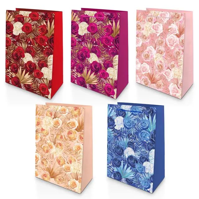 Zestaw zawiera 10 toreb z motywem złoconych róż – w miksie 5 kolorów: czerwony, ciemny róż, jasny róż, granat i beż. To spójna, elegancka seria, która świetnie prezentuje się na półce i ułatwia klientom szybki wybór opakowania.