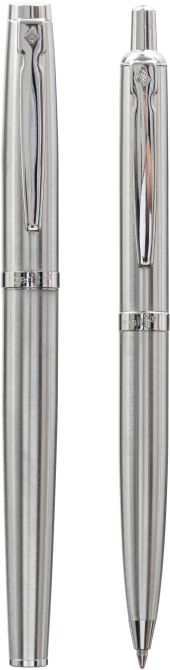 Eleganckie metalowe pióro wieczne i metalowy długopis Silver. Stalówka zakończona irydową kulką dla zapewnienia doskonałej jakości i łatwości pisania. Wymienne naboje atramentowe. Wymienny wkład wielkopojemny Zenith 4 z dokumentalnym tuszem w kolorze niebieskim gwarantującym trwałość zapisu. Długość linii pisania 4500 metrów.