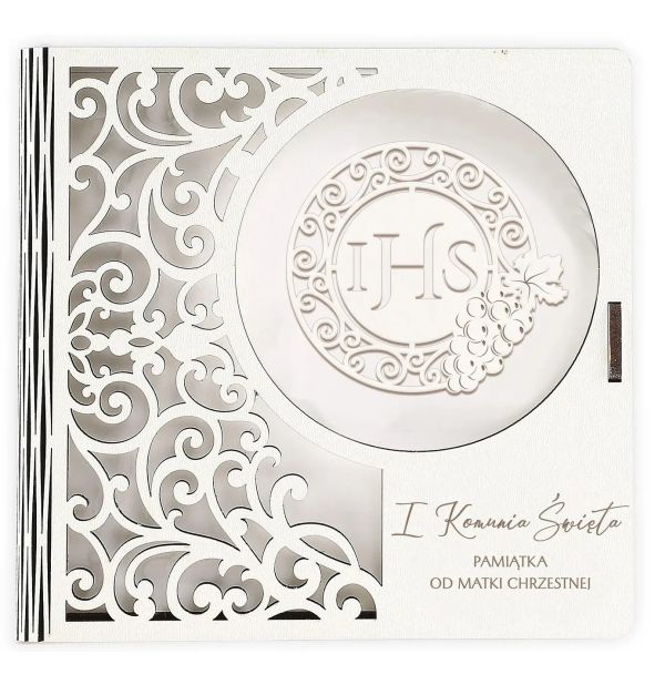 Cechy produktu: ✔ Album komunijny od Matki Chrzestnej – wyjątkowa pamiątka na Pierwszą Komunię Świętą. ✔ Drewniana okładka – trwała, solidna i estetycznie wykonana. ✔ Ażurowe wykończenie – dekoracyjny, precyzyjnie wycinany wzór o eleganckim charakterze. ✔ Motyw IHS i winogron – klasyczna symbolika komunijna podkreślająca religijny charakter upominku. ✔ Jasna, stonowana kolorystyka – uniwersalna i odpowiednia dla dziewczynki oraz chłopca. ✔ Sztywna forma albumu – wygodna do przechowywania zdjęć i pamiątek. ✔ Miejsce na fotografie i dedykacje – idealne do zachowania najważniejszych wspomnień z uroczystości. ✔ Starannie wykończony prezent komunijny – elegancki upominek od Matki Chrzestnej. ✔ Klasyczna stylistyka – dobrze prezentuje się w ofercie upominków i pamiątek religijnych.