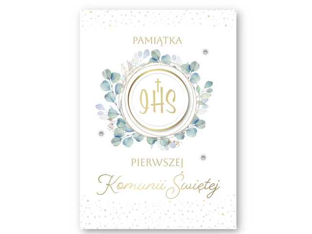 Elegancki karnet komunijny w formacie B6 to starannie wykonana pamiątka na wyjątkową okazję, jaką jest Pierwsza Komunia Święta. Na froncie znajduje się subtelna grafika z motywem błękitno-zielonych listków otaczających symbol IHS, co nadaje kartce delikatny, świeży i uroczysty charakter. Jasna kolorystyka w połączeniu ze złoceniami lub srebrzeniami podkreśla elegancję projektu, a przestrzenne elementy na froncie sprawiają, że karnet prezentuje się wyjątkowo estetycznie i atrakcyjnie na ekspozycji.