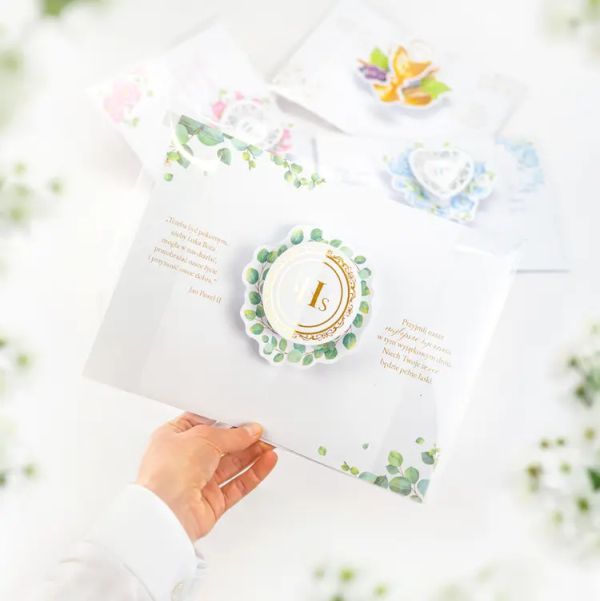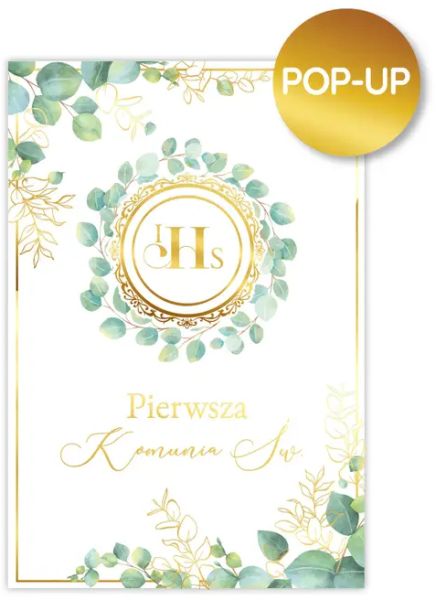 POP-UP 3D – po otwarciu kartki pojawia się przestrzenny, rozkładany element dekoracyjny.Religijna symbolika komunijna – motywy IHS, kielicha, hostii i roślinnych ornamentów podkreślają charakter uroczystości.Elegancka stylistyka premium – subtelne kolory, dekoracyjne ilustracje i staranne wykończenie budują wyjątkowy efekt wizualny.Gotowe życzenia w środku – produkt jest od razu gotowy do wręczenia.Format B6 z kopertą – praktyczny, wygodny i chętnie wybierany rozmiar kartki okolicznościowej.