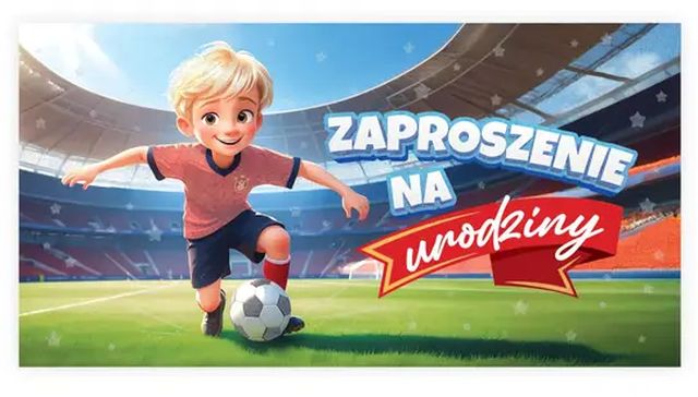 Kolorowa, dziecięca grafika – motywy tematyczne (np. sport, auta) budują klimat imprezy już od pierwszego spojrzenia.