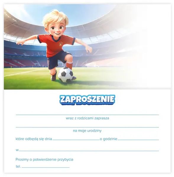 Przemyślany układ do wypełnienia – gotowy tekst i linie na dane (data, godzina, miejsce, kontakt) ułatwiają szybkie przygotowanie zaproszeń. Czytelna typografia – duże nagłówki i proste pola do wpisania informacji są wygodne dla rodziców. Zestaw sprzedażowy – opakowanie 10 sztuk zaproszeń + koperty, idealne do sprzedaży detalicznej i B2B.