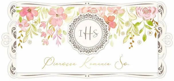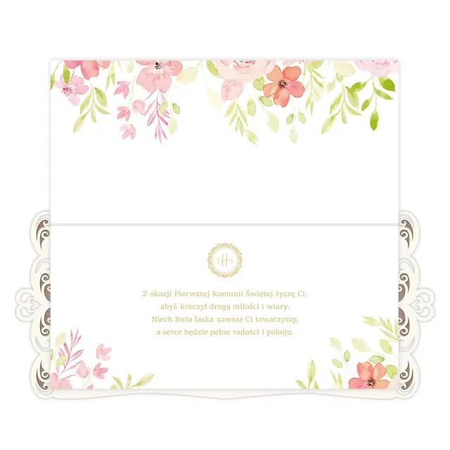 Komunijna kartka z grawerowaną drewnianą hostią i podkładem - różowe kwiaty z IHS