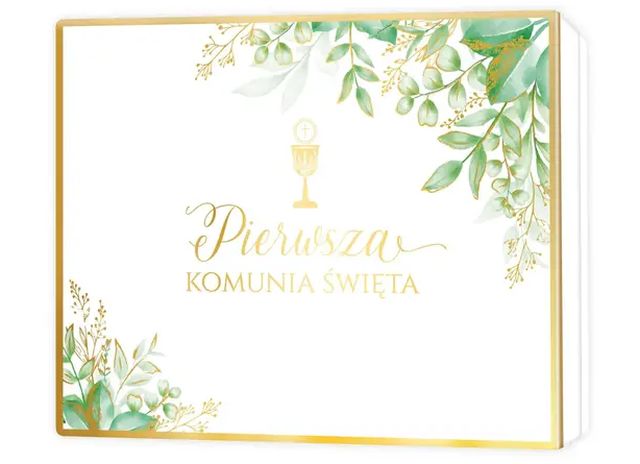 Złocone pudełko prezentowe na Pierwszą Komunię Świętą to elegancki i uniwersalny sposób na wręczenie prezentu w wyjątkowej oprawie. Produkt wyróżnia się subtelną, jasną kolorystyką z delikatnymi motywami roślinnymi w odcieniach zieleni oraz dekoracyjnym, złoconym rantem, który nadaje całości wyrazistego i uroczystego charakteru.