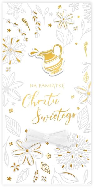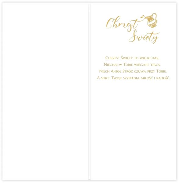Klasyczna kartka DL-R na Chrzest Święty zaprojektowana z myślą o ponadczasowej elegancji i sakralnym charakterze uroczystości. Centralnym elementem kompozycji jest symboliczny motyw gołąbka unoszącego się nad złoconą chrzcielnicą, otoczony subtelnymi ornamentami roślinnymi. Tło utrzymane w jasnej kolorystyce zostało wzbogacone delikatnym tłoczeniem, które nadaje kartce głębi i szlachetnego wyrazu. Całość dopełniają złocone akcenty oraz ręcznie wiązana biała kokardka, podkreślająca uroczysty charakter produktu. Kartka zachowuje klasyczną formę, dzięki czemu jest uniwersalnym wyborem na Chrzest Święty zarówno dla chłopca, jak i dziewczynki.