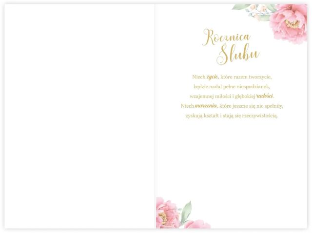 Kartka B6 LUX to wyjątkowa propozycja na uczczenie jednej z najpiękniejszych chwil w życiu – Rocznicy Ślubu. Zaprojektowana z myślą o eleganckim i sentymentalnym charakterze tej okazji, idealnie łączy subtelność z klasycznym stylem. Staranność wykonania oraz szlachetne zdobienia sprawiają, że karnet staje się nie tylko kartką okolicznościową, ale i piękną pamiątką.