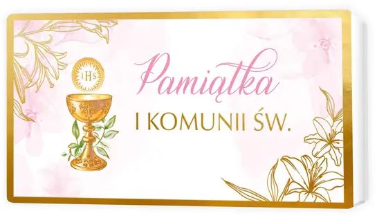 Na froncie znajduje się kielich z hostią oraz napis „Pierwsza Komunia Święta” wykonany złotą folią. Złocona ramka oraz subtelne zdobienia roślinne dodają całości lekkości i estetyki, dzięki czemu produkt wyróżnia się na tle bardziej klasycznych wzorów.
