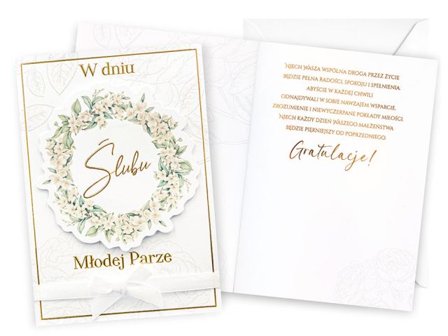 Cechy szczególne: wielkość: B6, 16.6 x 11.7 cm po złożeniu, koperta: w zestawie, kolorowa, zdobienia: kolorowe, różnorodne, bogate (w zależności od wzoru: przyklejane dekoracje, elementy biżuteryjne, odstawniki, metaliczne folie, tłoczenia itp.), okazja: Ślub