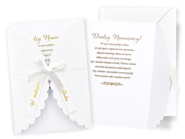 Cechy szczególne: wielkość: B6, 16.6 x 11.7 cm po złożeniu, koperta: w zestawie, kolorowa, zdobienia: kolorowe, różnorodne, bogate (w zależności od wzoru: przyklejane dekoracje, elementy biżuteryjne, odstawniki, metaliczne folie, tłoczenia itp.), okazja: Ślub