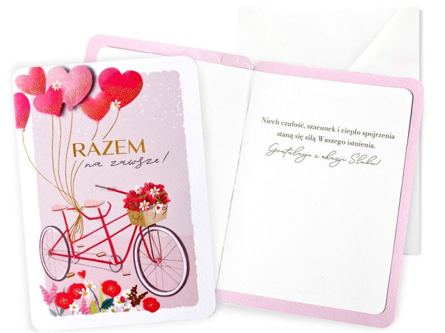 Cechy szczególne: wielkość: B6, 16.6 x 11.7 cm po złożeniu, koperta: w zestawie, kolorowa, zdobienia: kolorowe, różnorodne, bogate (w zależności od wzoru: przyklejane dekoracje, elementy biżuteryjne, odstawniki, metaliczne folie, tłoczenia itp.), okazja: ślub
