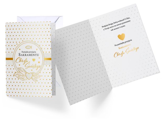 Cechy szczególne: wielkość: B6, 16.6 x 11.7 cm po złożeniu, koperta: dopasowana w zestawie, zdobienia: przynajmniej dwa rodzaje, często więcej - złota, srebrna lub perłowa folia, tłoczenia, wnętrze kartki: kolorowe, z życzeniami, okazja: chrzest