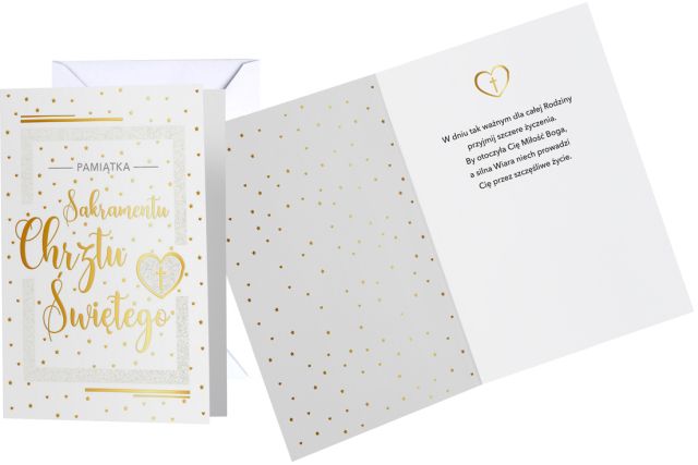 Cechy szczególne: wielkość: B6, 16.6 x 11.7 cm po złożeniu, koperta: dopasowana w zestawie, zdobienia: przynajmniej dwa rodzaje, często więcej - złota, srebrna lub perłowa folia, tłoczenia, wnętrze kartki: kolorowe, z życzeniami, okazja: chrzest