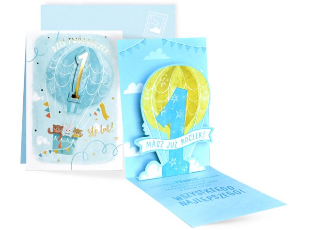 Kartka Pop-Up PU-021 Dziś Twój roczek Kartka z serii Pop-Up to idealny pomysł na oryginalną i nietypową pamiątkę dla dziecka Kartki wyróżniają się przestrzennym elementem wewnątrz, który uwypukla się wraz z jej otwarciem. W środku kartki znajdują się krótkie starannie dopasowane życzenia z miejscem na własną dedykację. Do kartki dołączona została dopasowana kolorystycznie koperta.