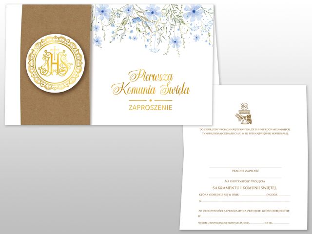 Stylowe i delikatne zaproszenie na I Komunię Świętą ozdobione złoconym motywem kwiatowym oraz symbolem IHS. Subtelna kolorystyka w odcieniach... |