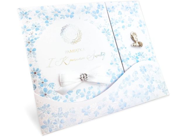 Album z książeczką z cytatami religijnymi i życzeniami, zawiera miejsce na pamiątkowe zdjęcia oraz wpisy. W środku znajduje się koperta.